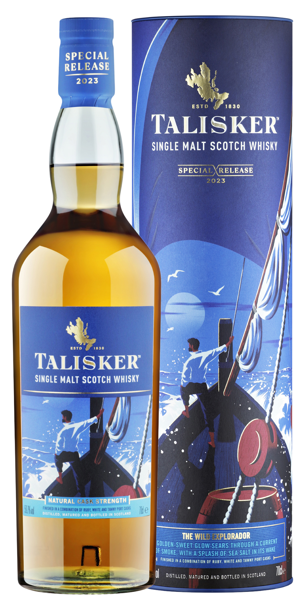 Этот Талискер с подзаголовком «Дикий исследователь» отдает дань уважения великим кораблям португальских исследователей, которые путешествовали по всему миру в неизвестные места. Иллюстратором выступил Рикардо Руи, чей фирменный стиль представляет собой сочетание сложного реализма и ностальгического ретро-элемента, что приводит к захватывающим и запоминающимся иллюстрациям. n nЭтот виски особенный: он является одним из двух в коллекции Diageo Special Releases 2023, Spirited Xchange, не имеющей определенного возраста. Это натуральная бочковая крепость, разлитая в бутылки сразу после выхода из бочки, без разбавления водой, и производится в Карбосте (Скай). Он известен своими сладкими и фруктовыми нотами. Его вкусовой профиль энергичный и подчеркивает классические характеристики во всех аспектах: соленый, дымный и пряный. Полный Талискер с богатым и крепким вкусом, который приобрел округлый и фруктовый оттенок благодаря тонкому послевкусию, отражающему классический характер бренда